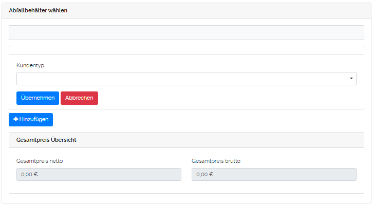 Die Seite "Abmeldung von Abfallbehältern" ist unterteilt in die Abschnitte: