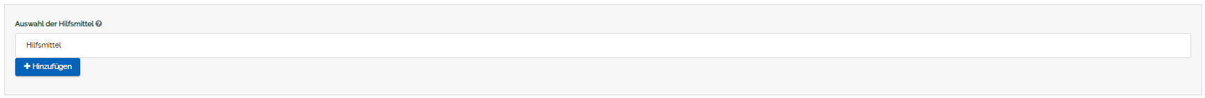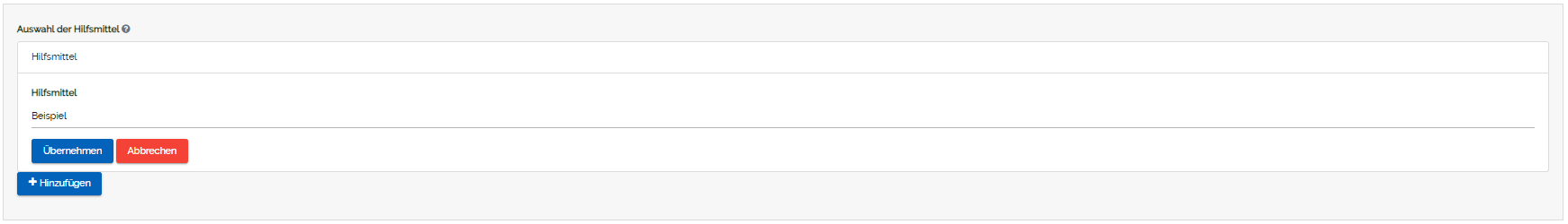 Sie können durch das Klicken auf "Hinzufügen" die Maske öffnen, um die jeweiligen Daten einzufügen. Hier können Sie alle Hilfsmittel eintragen, die daraufhin im Online Formular angezeigt werden. Durch klicken auf "Übernehmen" können Sie den Eintrag speichern. Eine detaillierte Erklärung zu der Komponente "Eintrag hinzufügen" und wie sich diese auf die Vorschau auswirkt finden Sie hier.