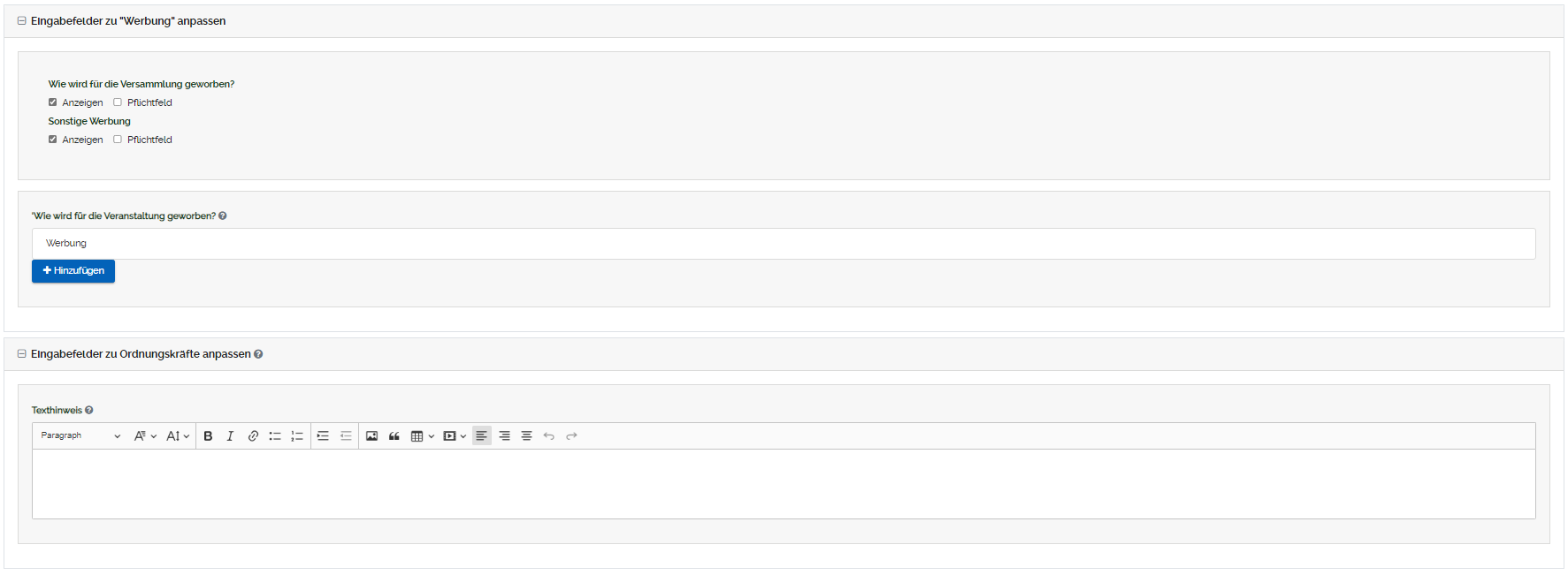 Die Seite "Weitere Angaben" ist unterteilt in fünf Abschnitte: "Texthinweis für diese Seite anpassen" Eine detaillierte Erklärung zu der Komponente "Texthinweis" und wie sich diese auf die Vorschau auswirkt finden Sie hier "Eingabefelder zu "Detaillierter Ablauf" anpassen", "Eingabefelder zu "Hilfsmittel" anpassen", "Eingabefelder zu "Werbung" anpassen", "Eingabefelder zu Ordnungskräfte anpassen" Die Einstellungen der Abschnitte "Eingabefelder zu "Hilfsmittel" anpassen" und "Eingabefelder zu "Werbung" anpassen" sind identisch, sie unterscheiden sich nur durch ihren Inhalt. Die Einstellungen der Abschnitte "Berechtigungen anpassen" und "Verwendungszweck anpassen" sind identisch, sie unterscheiden sich nur durch ihren Inhalt. |
