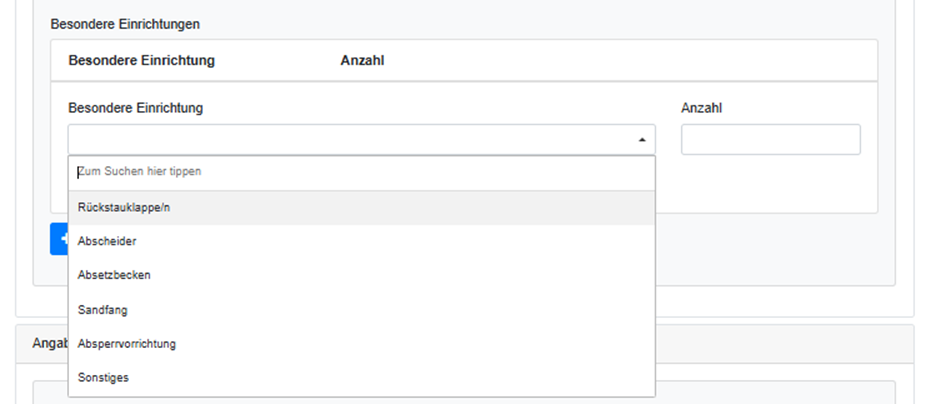 Falls die Frage „Gibt es besondere Einrichtungen auf dem Grundstück?“ mit „Ja“ beantwortet wurde, öffnet sich ein weiteres Fenster, in das man die besondere Einrichtung aus der vorhandenen Liste auswählt und die dazugehörige Anzahl angibt. Auch hier muss auf „Übernehmen“ geklickt werden, um die Angaben zu speichern.