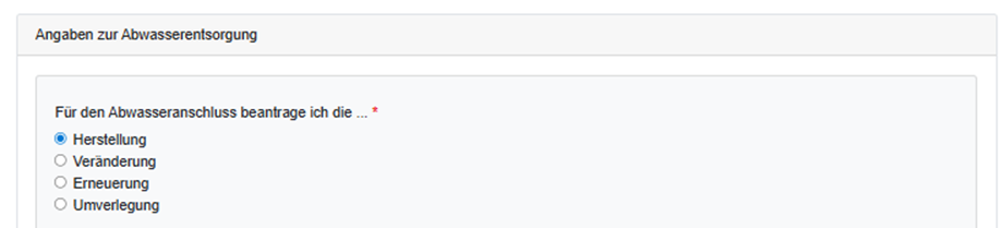 Man wählt aus welcher Abwasseranschluss beantragt werden soll. Beispielsweise, ob ein neuer Anschluss hergestellt oder ein bestehender Anschluss erneuert, verändert oder umgelegt werden muss.