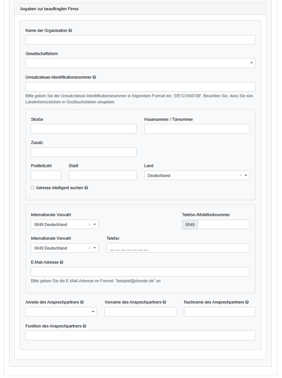 Falls die Frage „Werden die Grundstückserdarbeiten in Eigenleistung erledigt?“ mit „Nein“ beantwortet wurde, öffnen sich weitere Eingabefelder. Es wird nach den Angaben der beauftragten Firma gefragt, die die Grundstücksarbeiten vollziehen.