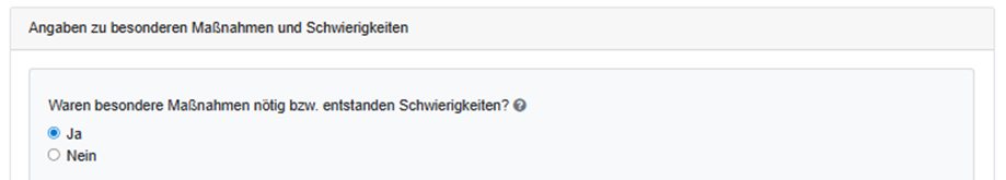 Falls die Frage „Waren besondere Maßnahmen nötig bzw. entstanden Schwierigkeiten?“ mit der Option „Ja“ beantwortet wurde, öffnet sich ein Eingabefeld in denen man die Maßnahmen und/oder Schwierigkeiten notiert.
