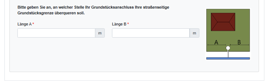 Falls unter „Bitte geben Sie hier die gewünschte Lage des Hauskastens ein.“ die Option „Übergabeschacht“ ausgewählt wurde und gibt die Stelle an, welche Stelle des Grundstücksanschlusses die straßenseitige Grundstücksgrenze überquert. Dafür soll die Länge A und B in m angegeben werden.