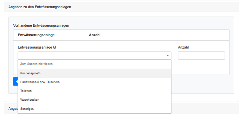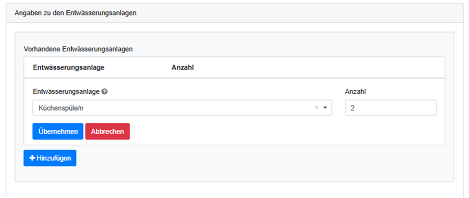 Um die Auswahl zu speichern, muss auf „Übernehmen“ geklickt werden. Um weitere Entwässerungsanlagen anzugeben, muss auf „Hinzufügen“ geklickt werden.