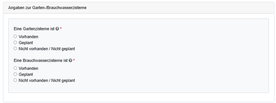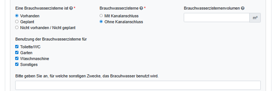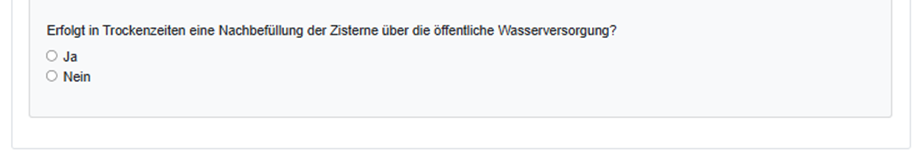 Falls einer der Zisterne vorhanden/geplant ist, wird ebenfalls abgefragt, ob eine Nachfüllung der Zisterne über eine öffentliche Wasserversorgung stattfindet.