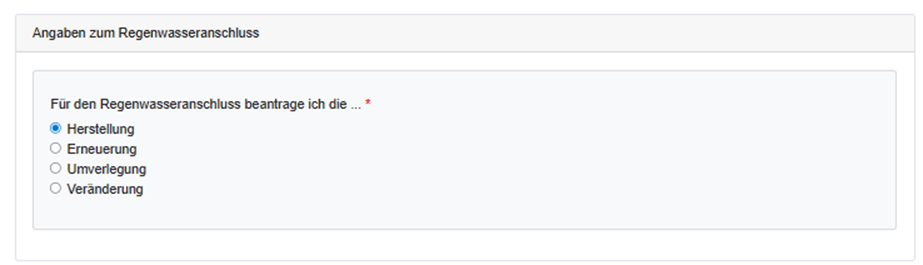 Man wählt aus, welchen Regenwasseranschluss man beantragen möchte. Beispielsweise, ob ein neuer Anschluss hergestellt oder ein bestehender Anschluss erneuert, verändert oder umverlegt werden muss.