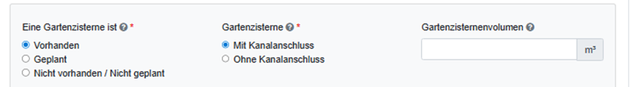 Falls eine Gartenzisterne vorhanden oder geplant ist, muss angegeben werden, ob diese mit oder ohne Kanalanschluss ist. Des Weiteren muss das Speichervolumen der Gartenzisterne notiert werden