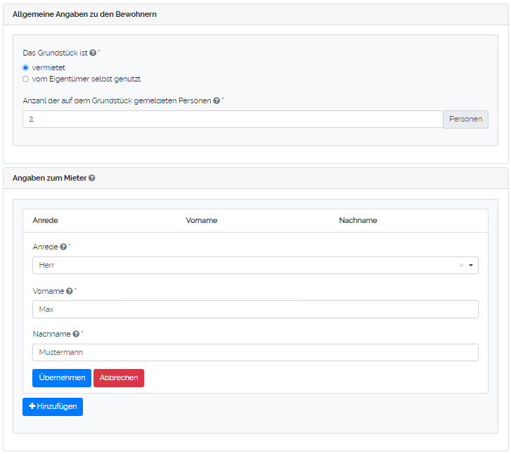 Man wählt aus, ob das Grundstück "vermietet" oder "vom Eigentümer selbst genutzt" wird. Man gibt die Anzahl der Personen an, die auf dem Grundstück gemeldet sind. Falls das Grundstück vermietet ist, gibt man die persönlichen Daten des Mieters an. Durch klicken auf "Übernehmen" kann der Eintrag gespeichert werden.
