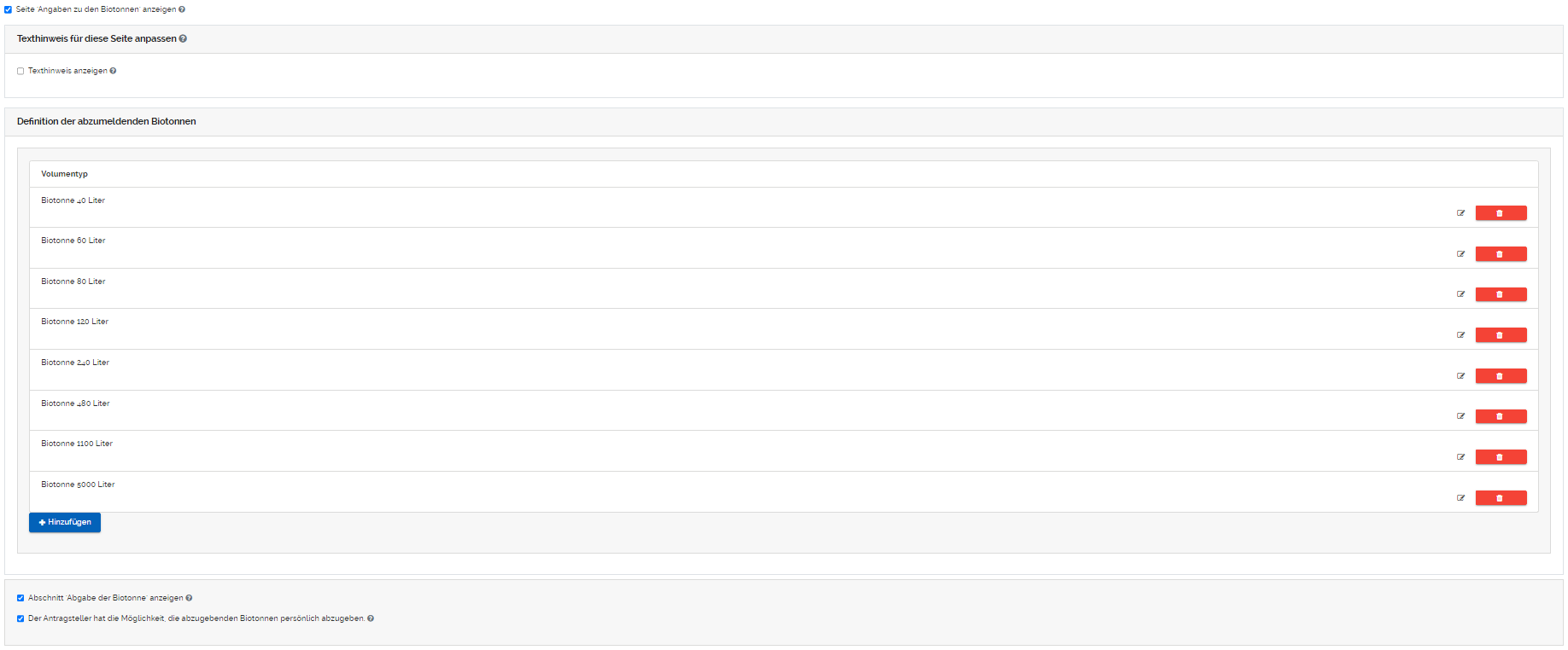 "Definition der abzumeldenden Biotonnen": Am Beispiel "Berechtigungen anpassen" Sie können durch das Klicken auf "Hinzufügen" die Maske öffnen, um die jeweiligen Daten einzufügen. Hier können Sie alle Volumentypen eintragen, die daraufhin im Online Formular angezeigt werden.