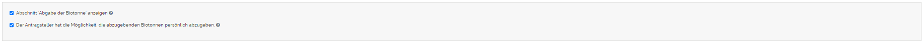 "Seite "Angaben zu den Biotonnen" anzeigen": Sie können durch das Setzen des Häkchens in die Checkbox die Seite "Angaben zu den Biotonnen " im Online Formular anzeigen lassen. Durch das entfernen des Häkchens, können Sie die Seite im Online Formular ausblenden. Eine detaillierte Erklärung zu der Komponente "Checkbox" und wie sich diese auf die Vorschau auswirkt finden Sie hier.
