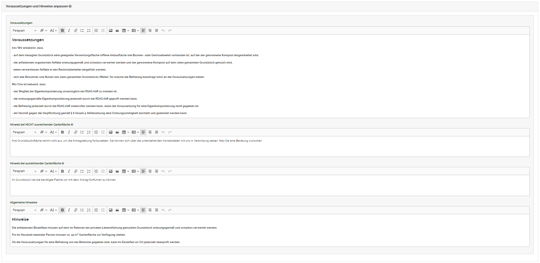 Des Weiteren können Sie unter "Hinweis bei NICHT ausreichender Gartenfläche" einen Hinweis hinterlegen, der nach Eingabe der verfügbaren Gartenfläche angezeigt wird, wenn diese KLEINER als die erforderliche Gartenfläche ist. Der "Hinweis bei ausreichender Gartenfläche" wird nach Eingabe der verfügbaren Gartenfläche gezeigt, wenn diese GRÖßER (od. gleich) als die erforderliche Gartenfläche ist. Unter "Allgemeine Hinweise" können weitere Hinweise hinterlegt werden. Eine detaillierte Erklärung zu der Komponente "Texthinweis" und wie sich diese auf die Vorschau auswirkt finden Sie hier. |