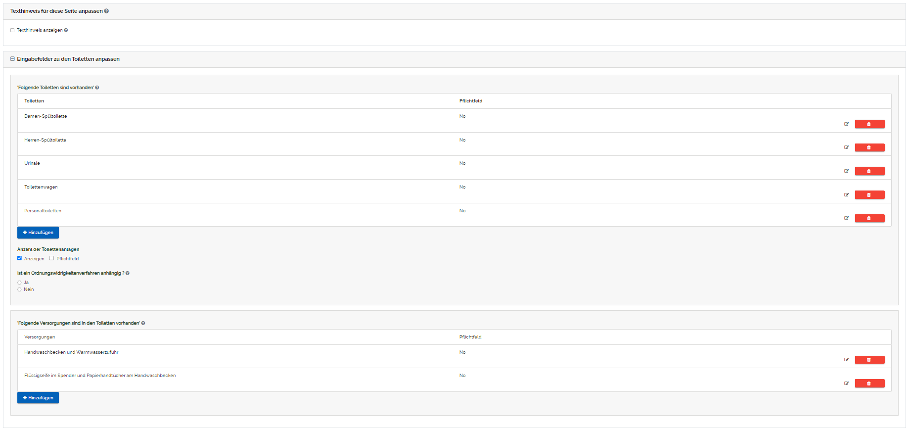 Die Seite "Angaben zu den sanitären Anlagen" ist unterteilt in zwei Abschnitte: "Texthinweis für diese Seite anpassen" Eine detaillierte Erklärung zu der Komponente "Texthinweis" und wie sich diese auf die Vorschau auswirkt finden Sie hier "Eingabefelder zu den Toiletten anpassen" |