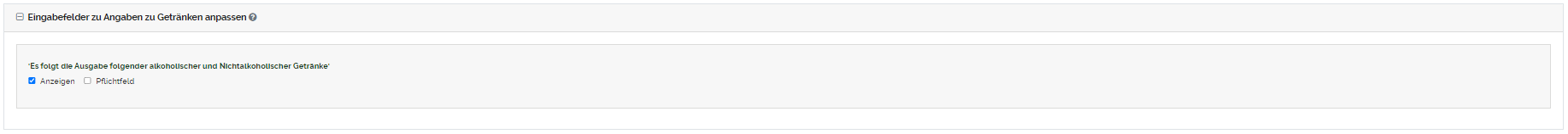 "Eingabefelder anpassen": Am Beispiel "Eingabefelder zu Angaben zu Getränken anpassen" Sie können jedes Eingabefeld im Online Formular (als Pflichtfeld) anzeigen lassen. Durch das Setzen des Häkchens in die Checkboxen werden die Eingabefelder im Online Formular (als Pflichtfeld) angezeigt. Durch das entfernen des Häkchens wird das Eingabefeld im Online Formular ausgeblendet oder nur als freiwilliges Feld markiert. Eine detaillierte Erklärung zu der Komponente "Anzeigen/Pflichtfeld" und wie sich diese auf die Vorschau auswirkt finden Sie hier. |