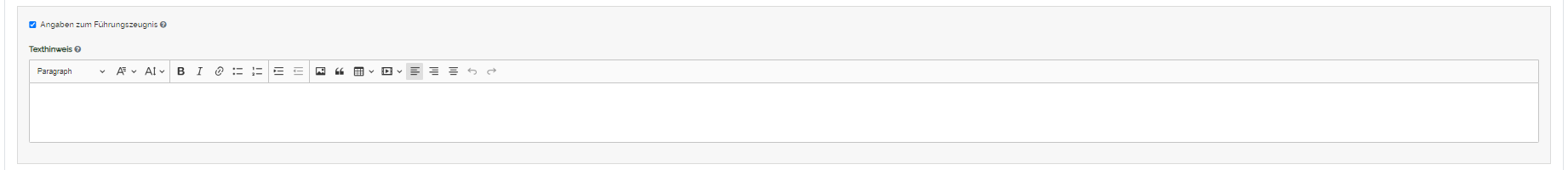 Sie können einen Hinweis hinterlegen, der sich auf die Angabe zum Führungszeugnis bezieht. Eine detaillierte Erklärung zu der Komponente "Texthinweis" und wie sich diese auf die Vorschau auswirkt finden Sie hier. Die Einstellungen der Abschnitte "Angaben zum Führungszeugnis" und "Angaben zum Gewerbezentralregisterauszug" sind identisch, sie unterscheiden sich nur durch ihren Inhalt. |