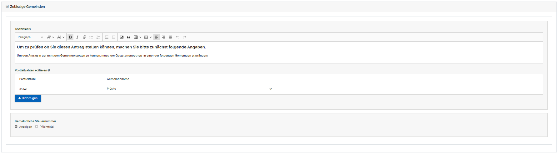 "Zulässige Gemeinden": Sie können einen Hinweis hinterlegen, der sich auf die Antragsberechtigung bezieht. Sie können angeben, dass der Antrag in der Gemeinde gestellt werden muss, in der der Gaststättenbetrieb stattfindet. Eine detaillierte Erklärung zu der Komponente "Texthinweis" und wie sich diese auf die Vorschau auswirkt finden Sie hier. Sie können durch das klicken auf "Hinzufügen" die Maske öffnen, um die jeweiligen Daten einzufügen.