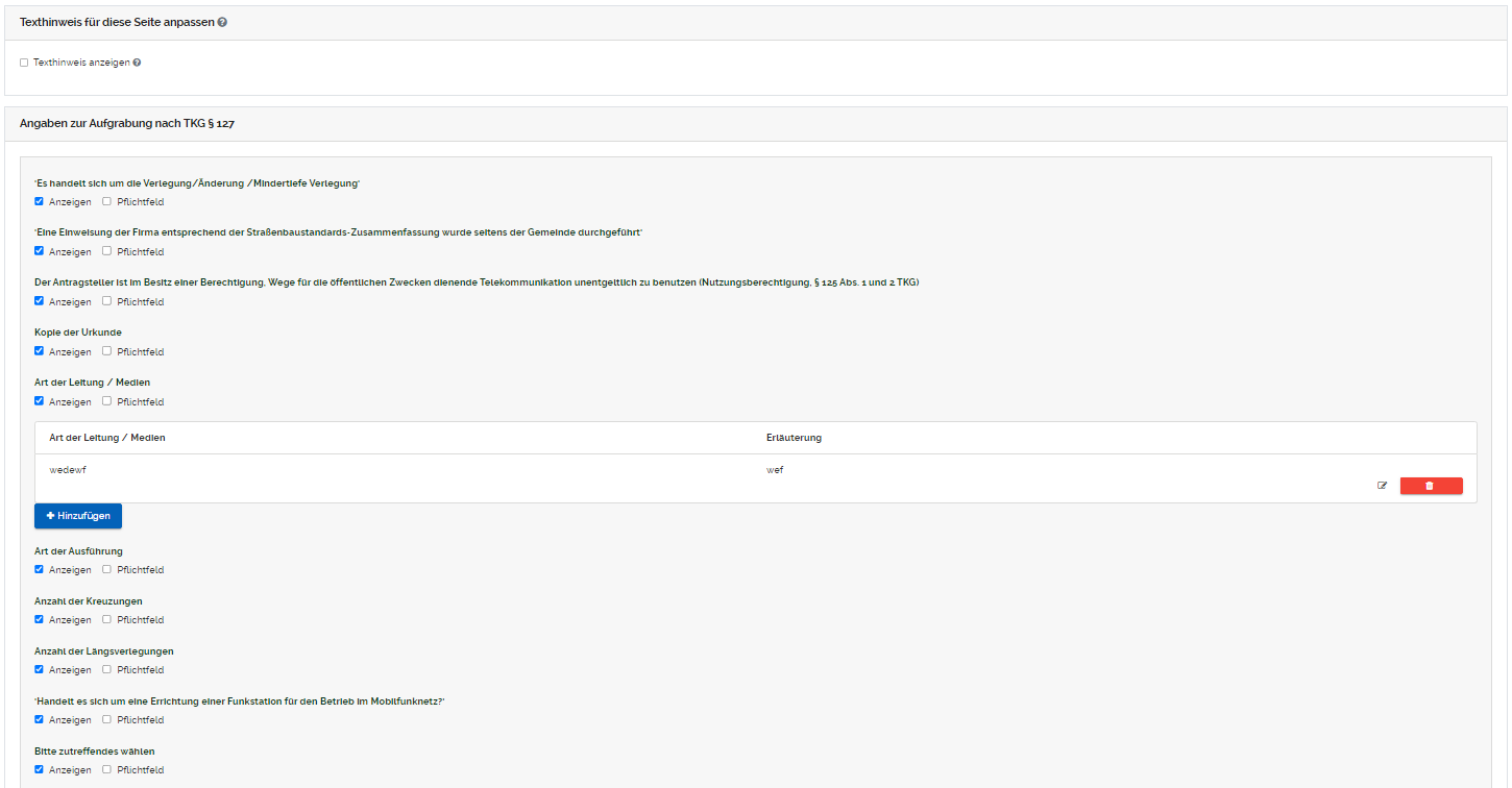 Die Seite "Angaben zur Aufgrabung nach TKG § 127" ist unterteilt in fünf Abschnitte: "Texthinweis für diese Seite anpassen" Eine detaillierte Erklärung zu der Komponente "Texthinweis" und wie sich diese auf die Vorschau auswirkt finden Sie hier "Eingabefelder zur Geburt" "Eingabefelder zur beurkundeten Person" "Berechtigungen anpassen" "Verwendungszweck anpassen" Die Einstellungen der Abschnitte "Eingabefelder zur Geburt" und "Eingabefelder zur beurkundeten Person" sind identisch, sie unterscheiden sich nur durch ihren Inhalt. Die Einstellungen der Abschnitte "Berechtigungen anpassen" und "Verwendungszweck anpassen" sind identisch, sie unterscheiden sich nur durch ihren Inhalt. |