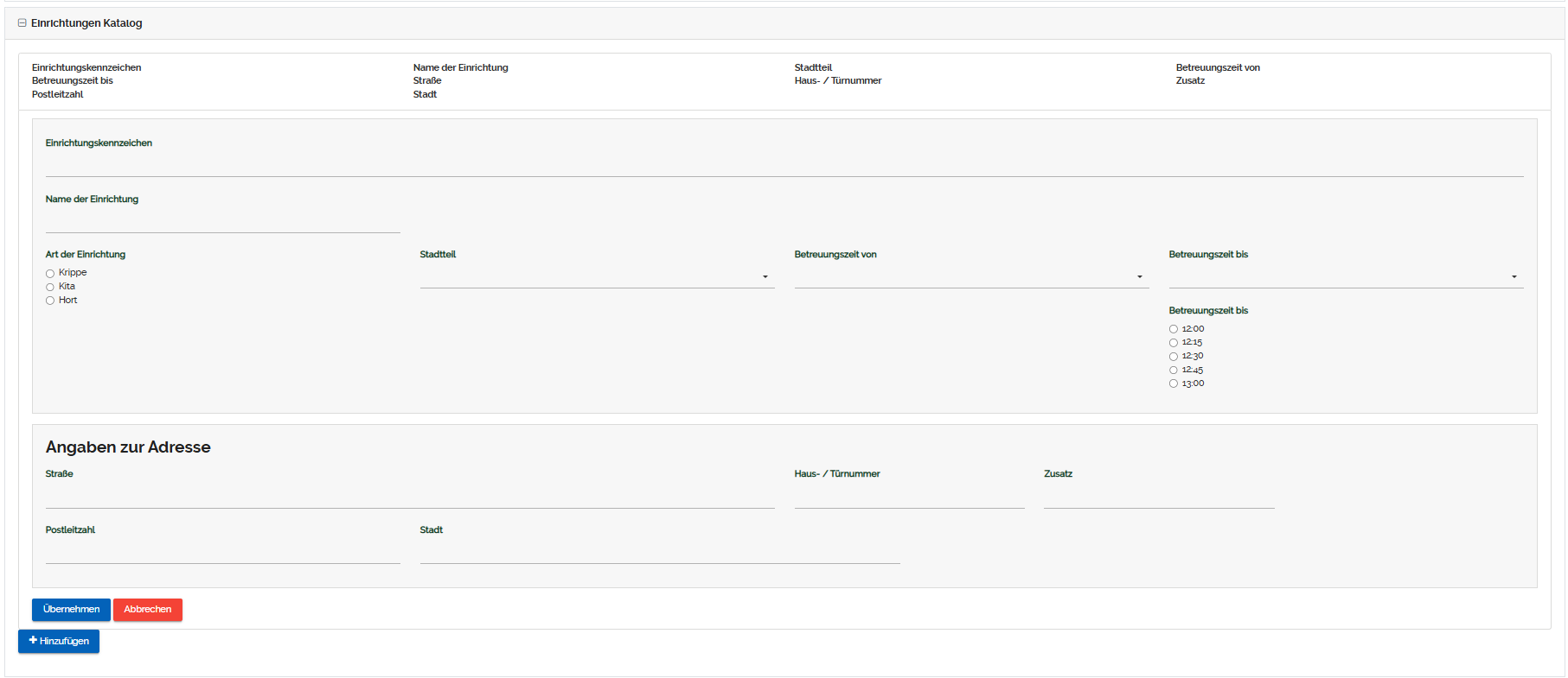 "Einrichtungen Katalog": Sie können durch das Hier können Sie alle Eingabefelder befüllen, die daraufhin im Online Formular Die Eingabefelder "Einrichtungskennzeichen", "Name der Einrichtung" und alle Eingabefelder unter "Angaben zur Adresse" werden händisch eingetragen. Beim Radiofeld "Art der Einrichtung" wählen Sie eins der angezeigten Einrichtungsarten aus. Die restlichen Eingabefelder füllen Sie aus, indem Sie aus der Liste wählen die angezeigt wird, wenn Sie auf das jeweilige Eingabefeld klicken. Die Listen bestehen auf der Grundlage der zuvor gemachten Einträge unter "Basis Angaben". Durch Eine detaillierte Erklärung zu der Komponente "