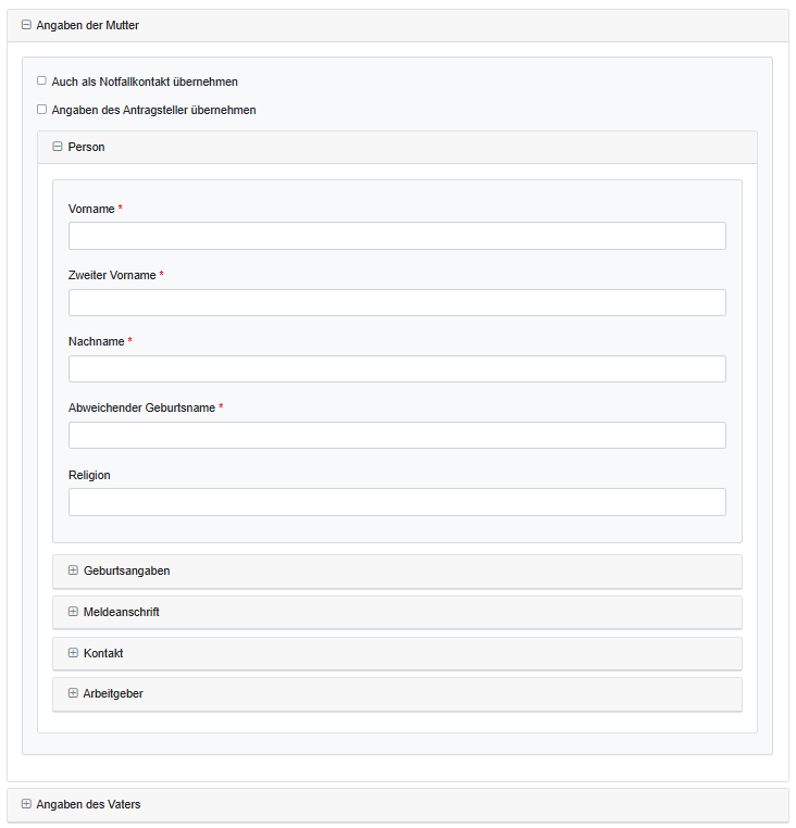Es wird abgefragt, ob die Mutter als Notfallkontakt hinterlegt werden soll. Sofern sie zugleich Antragstellerin ist, können deren bereits erfasste Angaben übernommen werden. Ist dies nicht der Fall, werden die persönlichen Daten der Mutter separat abgefragt. Für den Vater werden die gleichen Angaben erhoben.