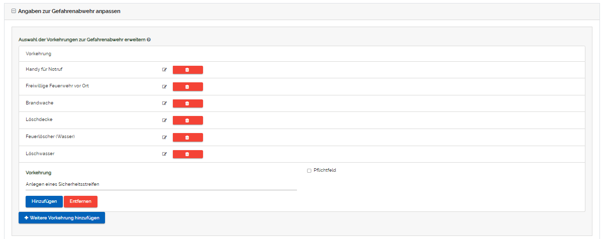 Sie können die Auswahl der Vorkehrungen zur Gefahrenabwehr bearbeiten, löschen oder neue Arten hinzufügen. Außerdem können Sie auswählen, welche der Eingabefelder Pflichtfelder sein sollen, indem Sie ein Häkchen in die Box setzen.