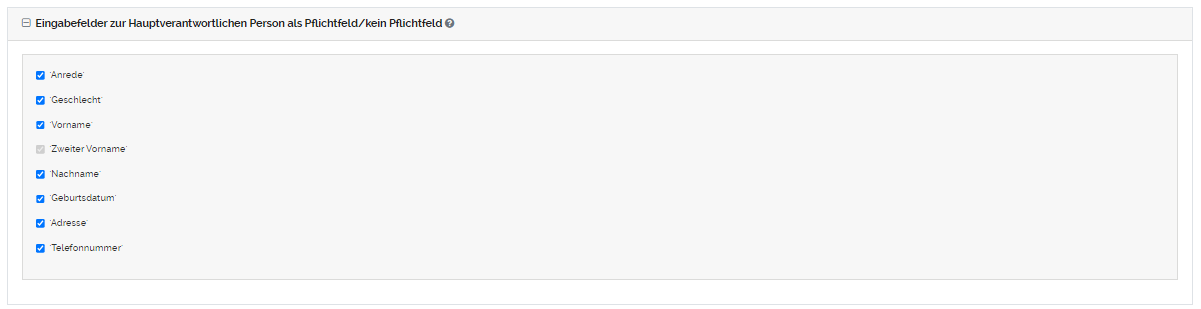 In dem Sie Häkchen in die Boxen setzen, können Sie auswählen welche Eingabefelder als Pflichtfelder angezeigt werden sollen. Falls kein Häkchen gesetzt wird, wird das Eingabefeld als freiwilliges Eingabefeld angezeigt und muss vom Antragsteller nicht ausgefüllt werden. |