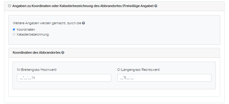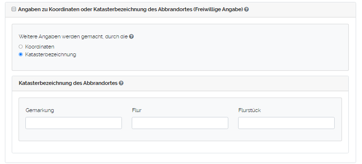 Ob die "Angaben zu Koordinaten oder Katasterbezeichnung des Abbrandortes" abgefragt/eingeblendet werden sollen, können Sie in der Konfiguration der Seite "Angaben zum Abbrandort" anpassen. |