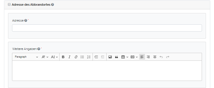 Ob und welche Eingabefelder Pflicht sind, können Sie in der Konfiguration der Seite "Angaben zum Abbrandort" anpassen. |