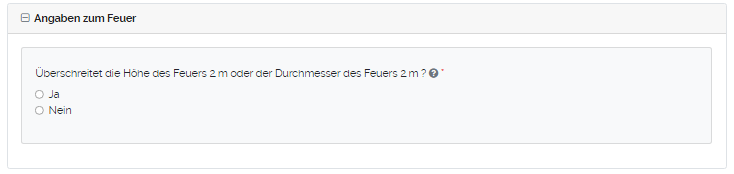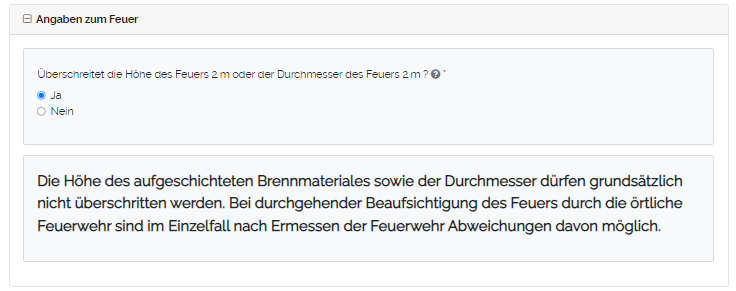 Der Antragsteller muss angeben, ob die Höhe des Feuers 2 m oder der Durchmesser des Feuers 2 m überschreitet.