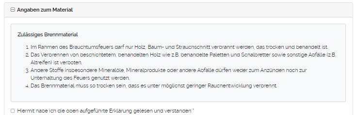 In der Konfiguration der Seite "Angaben zum Material und Feuer" können Sie die Erklärung anpassen.