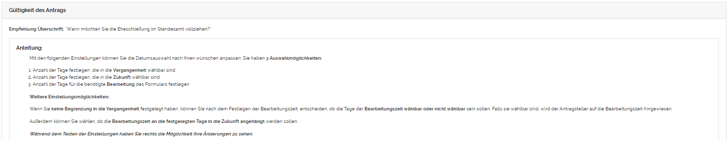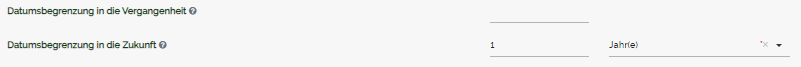 Die Datumsbegrenzung kann in die Vergangenheit und/oder in die Zukunft beeinflusst werden. Bleibt das jeweilige Eingabefeld leer, ist der Zeitraum in der Vergangenheit/Zukunft NICHT wählbar. Sie können für die beiden Eingabefelder die Einheit (Tage, Wochen, Monate, Jahre) selbst festlegen.