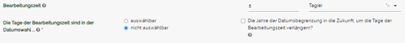 Sie können auswählen, ob die Tage, die Sie als Bearbeitungszeit festlegen, nicht auswählbar bzw. auswählbar sind. Sie haben auch hier die Möglichkeit, die Einheit selbst zu wählen.