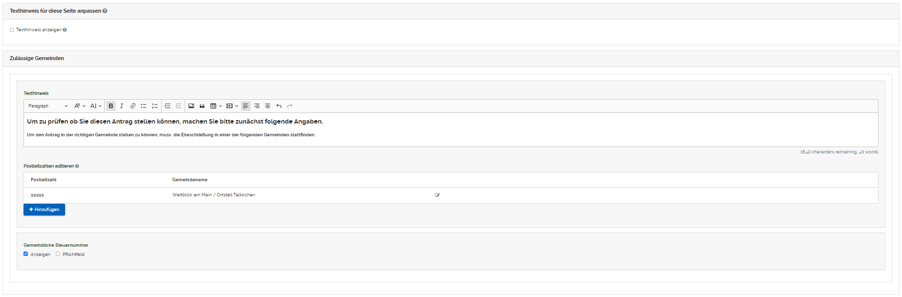 Sie können das Eingabefeld "Gemeindliche Steuernummer" im Online Formular (als Pflichtfeld) anzeigen lassen. Durch das Setzen des Häkchens in die Checkbox wird das Eingabefeld im Online Formular (als Pflichtfeld) angezeigt. Durch das entfernen des Häkchens wird das Eingabefeld im Online Formular ausgeblendet oder nur als freiwilliges Feld markiert.