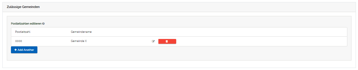 Hier können Sie die Gemeinden hinzufügen, für die eine Antragsberechtigung gestattet ist. Der Antragsteller muss in einer dieser Gemeinden gemeldet sein. |