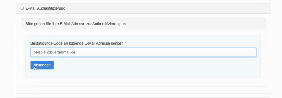 Nach erfolgreicher Authentifizierung über eine E-Mail-Adresse werden alle weiteren Formularseiten freigeschaltet.