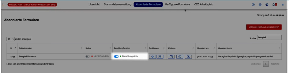 Formulare im Status „Nicht produktiv“ sind für Bürger nicht sichtbar und können in diesem Modus konfiguriert, getestet und bei Bedarf wieder veröffentlicht werden. Wir empfehlen, vor jeder Konfigurationsänderung den Status auf „Nicht produktiv“ zu setzen, um zu verhindern, dass veraltete Formularversionen öffentlich zugänglich sind. Nach Abschluss der Konfiguration sollte der Status auf „Produktiv“ gesetzt werden, damit das aktualisierte Formular im digitalen Rathaus sichtbar ist.