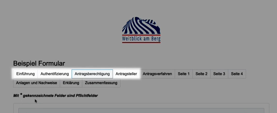 Nach ihrem Logo folgen der Formularname als Überschrift sowie die Seiten des Formulars in einer Reiter-Navigation.