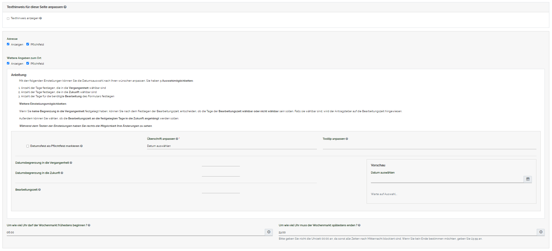 Geben Sie an um wie viel Uhr der Wochenmarkt frühestens beginnen darf und spätestens enden muss. Beachten Sie, dass eine Zeitangabe getätigt werden muss, da sonst eine Fehlermeldung im Online Formular erscheint. Falls keine bestimmte Zeit angegeben werden soll, geben Sie für den Beginn 00:00 Uhr an und für das Ende 23:59 Uhr. Eine detaillierte Erklärung zu der Komponente "Datums-/Uhrzeitfeld" finden Sie hier. |