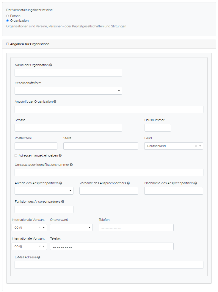 Falls der Veranstaltungsleiter eine Organisation ist, gibt man die Daten der Organisation an.