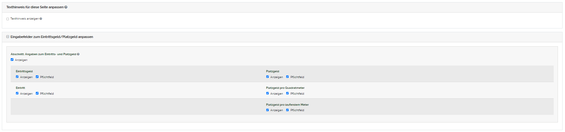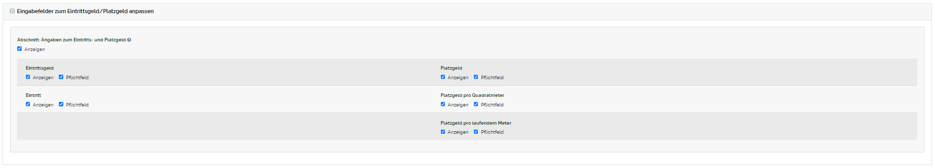 "Eingabefelder zum Eintrittsgeld/Platzgeld anpassen": Sie können jedes Eingabefeld im Online Formular (als Pflichtfeld) anzeigen lassen. Durch das Setzen des Häkchens in die Checkboxen werden die Eingabefelder im Online Formular (als Pflichtfeld) angezeigt. Durch das entfernen des Häkchens wird das Eingabefeld im Online Formular ausgeblendet oder nur als freiwilliges Feld markiert. Eine detaillierte Erklärung zu der Komponente "Anzeigen/Pflichtfeld" und wie sich diese auf die Vorschau auswirkt finden Sie hier. |