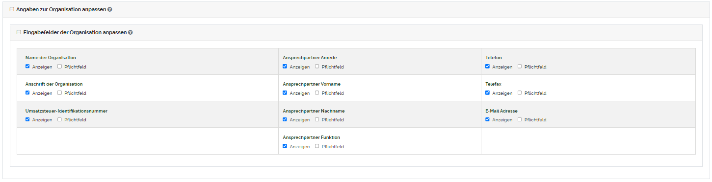 Die Einstellungen der Abschnitte "Angaben zur Person anpassen" und "Angaben zur Organisation anpassen" sind identisch, sie unterscheiden sich nur durch ihren Inhalt. |