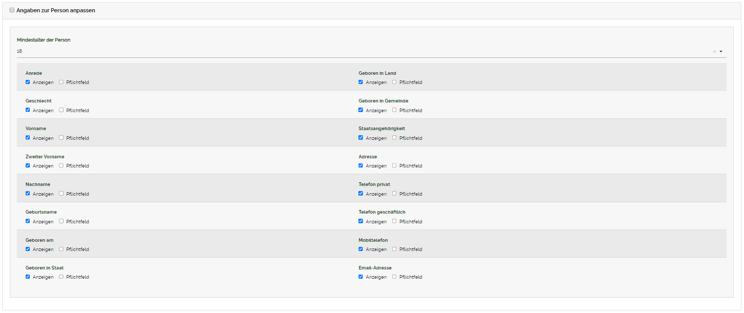 "Angaben anpassen": Am Beispiel "Angaben zur Person anpassen" Im Auswahlfeld "Mindestalter der Person" können Sie das Mindestalter auswählen, dass die abgefragte Person haben muss. Sie können zwischen den Altersgrenzen: 14, 16 und 18 wählen. Eine detaillierte Erklärung zu der Komponente "Mindestalter" und wie sich diese auf die Vorschau auswirkt finden Sie hier.