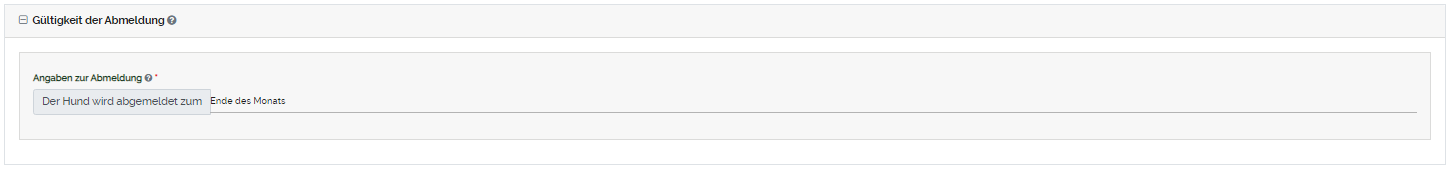 "Gültigkeit der Abmeldung": Sie können einen Hinweis zu "Angaben zur Abmeldung" des Hundes im Online Formular anzeigen lassen, indem Sie die Lücke nach "Der Hund wird abgemeldet zum" ausfüllen.