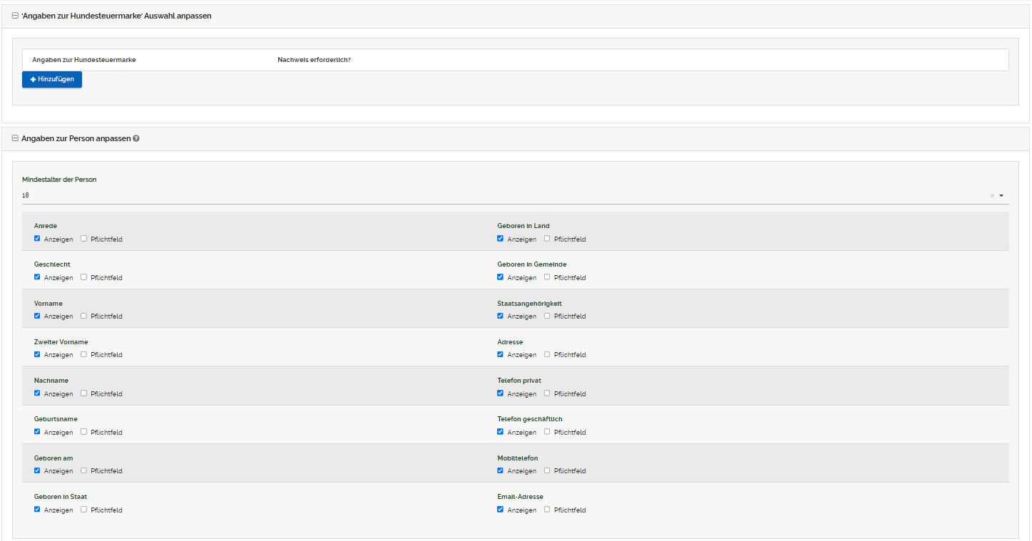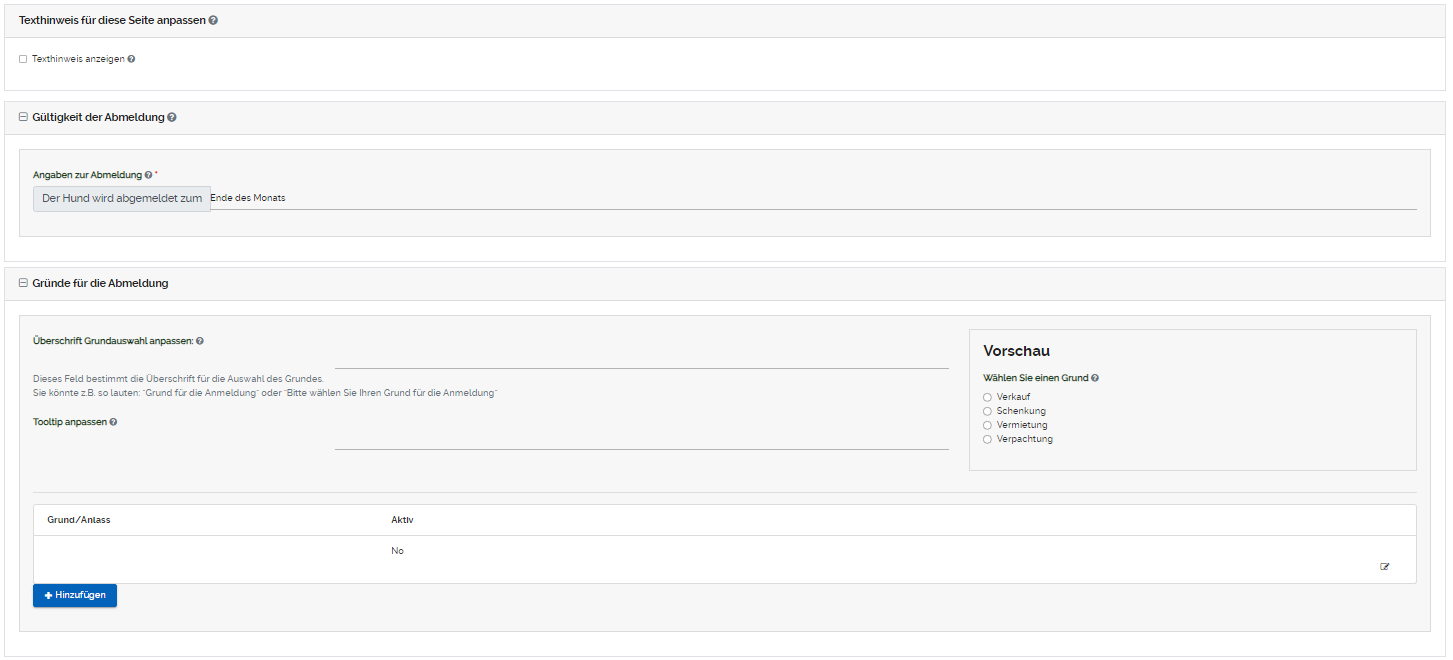 Die Seite "Abmeldung Hund" ist unterteilt in drei Abschnitte: "Texthinweis für diese Seite anpassen" Eine detaillierte Erklärung zu der Komponente "Texthinweis" und wie sich diese auf die Vorschau auswirkt finden Sie hier "Gültigkeit der Abmeldung" "Gründe für die Abmeldung" "Angaben zur Hundesteuermarke Auswahl anpassen" "Angaben zur Person anpassen" "Angaben zur Organisation anpassen"