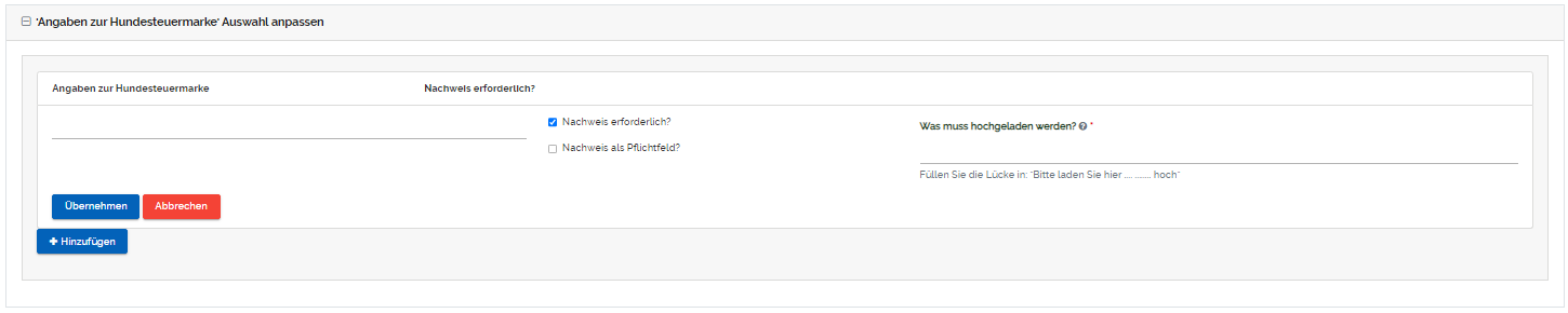 "Angaben zur Hundesteuermarke Auswahl anpassen": Sie können durch das Klicken auf "Hinzufügen" die Maske öffnen, um die jeweiligen Daten einzufügen. Sie können alle Angaben zur Hundesteuermarke eintragen, die daraufhin im Online Formular angezeigt werden. Zusätzlich können Sie einen Nachweis fordern und die Angabe als Pflichtfeld anzeigen. Durch klicken auf "Übernehmen" können Sie den Eintrag speichern. Eine detaillierte Erklärung zu der Komponente "Eintrag hinzufügen" und wie sich diese auf die Vorschau auswirkt finden Sie hier.