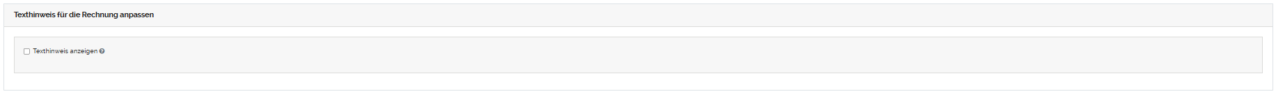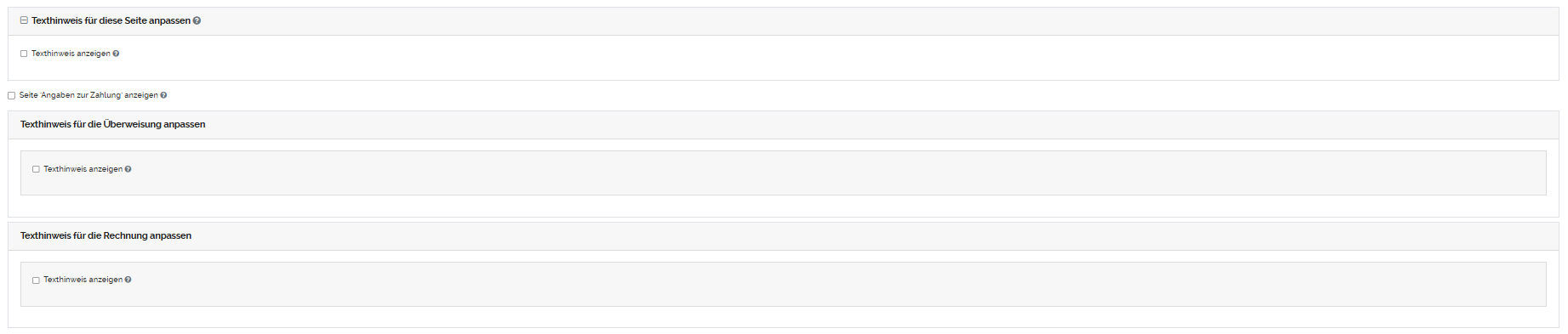 "Texthinweis für die Rechnung anpassen": ![]() Die Einstellungen der Abschnitte "Texthinweis für die Überweisung anpassen" und "Texthinweis für die Rechnung anpassen" sind identisch, sie unterscheiden sich nur durch ihren Inhalt. |
