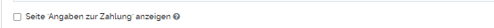 "Seite 'Angaben zur Zahlung' anzeigen": Sie können die Seite im Online Formular anzeigen lassen. Durch das Setzen des Häkchens in die Checkbox wird die Seite im Online Formular angezeigt. Durch das entfernen des Häkchens wird die Seite im Online Formular ausgeblendet.