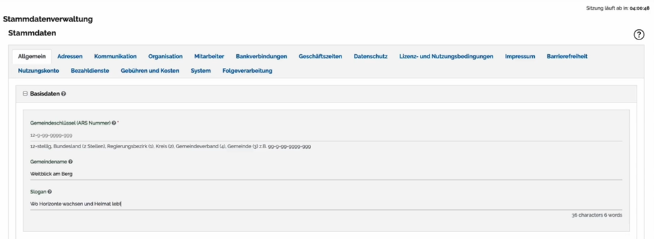 Zunächst hinterlegen Sie ihren Gemeindeschlüssel in Form der ARS-Nummer. Danach geben Sie den Gemeindenamen sowie den Slogan ihrer Gemeinde an.