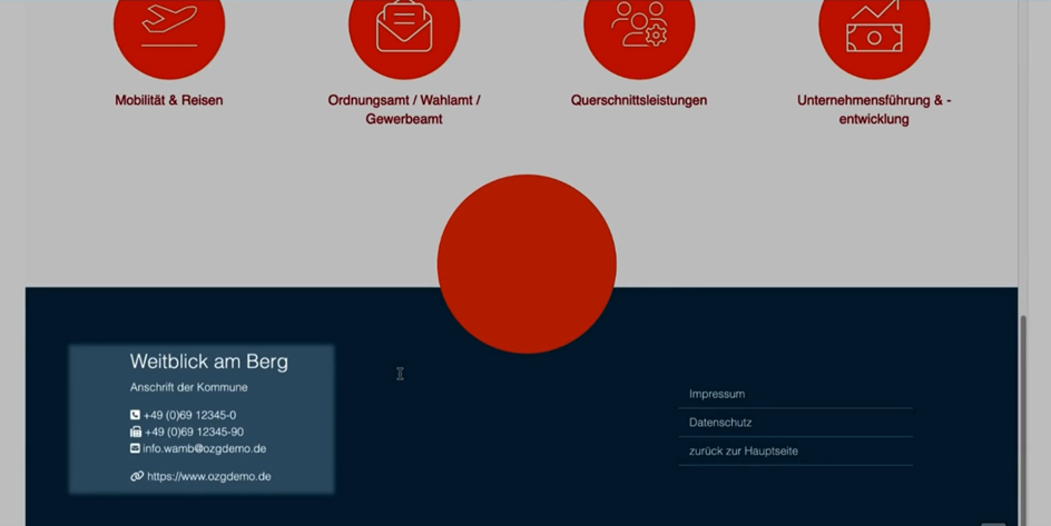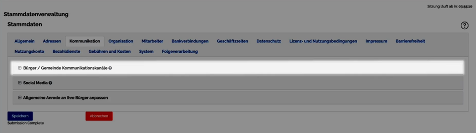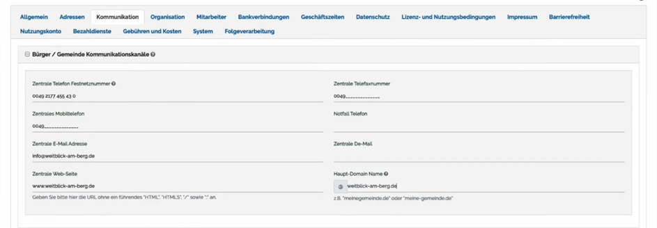 Im ersten Abschnitt legen Sie die zentralen Kommunikationskanäle wie die Zentrale Festnetznummer, die zentrale E-Mail-Adresse und die Web-Seite an. Diese Kontaktdaten werden unter anderem im digitalen Rathaus angezeigt und können von ihnen als „Zentrale Gemeindedaten“ in der Formular-Konfiguration ausgewählt werden.