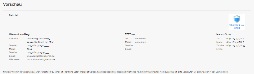 Alle wählbaren Kontaktdaten hinterlegen Sie in den dafür vorgesehenen Abschnitten in der Stammdatenverwaltung. Eine detaillierte Erklärung finden Sie