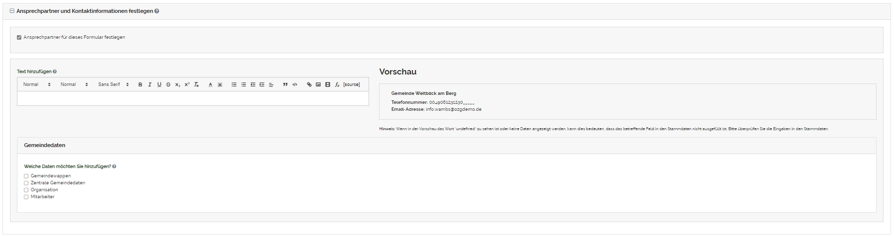 Die Seite "Ansprechpartner und Kontaktinformationen" dient dazu die Kontaktdaten der Gemeinde zu hinterlegen. Am Ende jeder Seite werden die zuständigen Ansprechpartner für das jeweilige Online Online-Formular angezeigt.